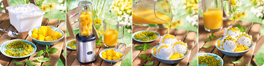 2. Mangowürfel (2/3 der Menge), Zitronensaft und Puderzucker mit einem Smoothie Maker oder einem Stabmixer fein pürieren.